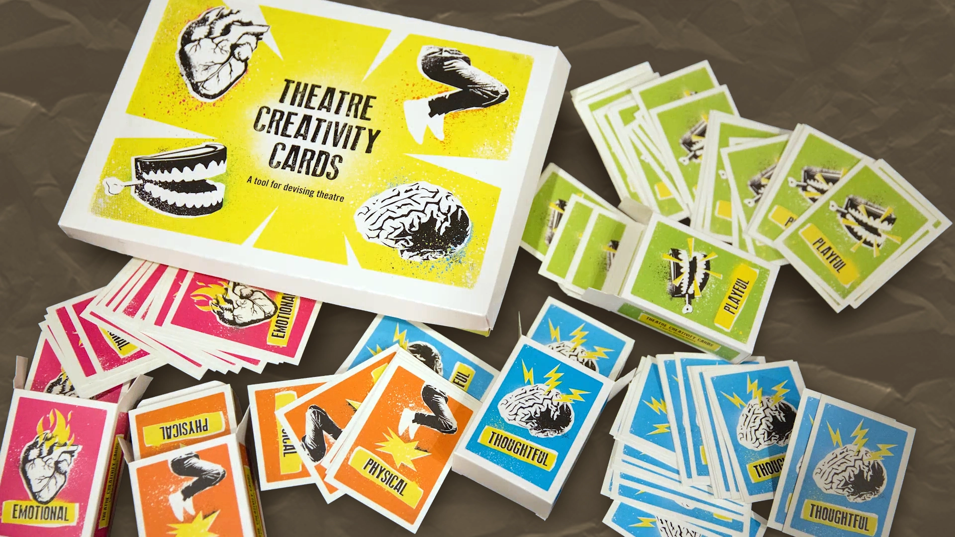 Working in hundreds of schools each year, we began developing the Theatre Creativity Cards in order to offer a simple, yet highly effective tool to aid students in devising. The Theatre Creativity Cards are a set of cards that support the generation of ideas when devising performance.