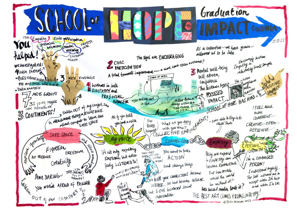 We also collaborated with Academics to shape the project and measure its impact. Laura Taylor (University College Dublin), Katrina Brown (University of Exeter) and John Lambie (Anglia Ruskin University) helped us to plan lessons and measure the project’s impact. The qualitative and quantitate findings from The School of HopeAcademic’s research were extremely favourable, with levels of empathy and pro social behaviourincreasing in 53% of all of the young creatives surveyed. 64% of the young creatives also showed an increase in Civic Participation.